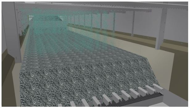 • Die Stahlschlacke / Recyclingbeton (Waste) wird auf dem Schubboden unserer Kapsel mit einer 40 – 50 cm Schicht gleichmäßig verteilt.