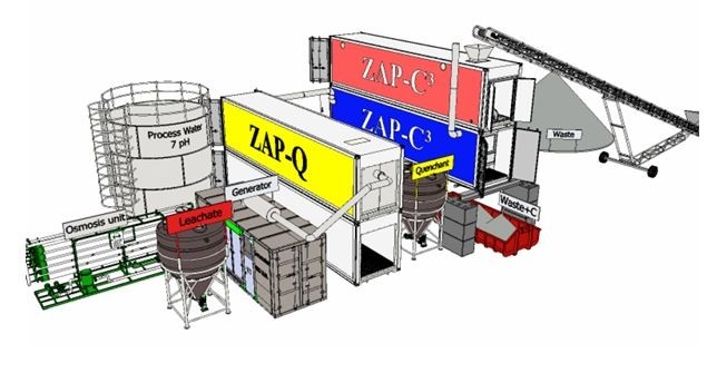 • Aus gereinigten Abgasen mit reduziertem CO₂ Gehalt werden Nanoblasen mittels eines Generators in das Leachate eingeblasen und die 2. Reaktion findet statt, da zum wiederholten Male CO₂ in dem Leachate gebunden wird. Dieser Vorgang ist entscheidend um einen geschlossenen Kreislauf des Prozesswassers zu gewährleisten! Es werden 25000 Liter Wasser benötigt, um eine Tonne CO2 zu sequestrieren.